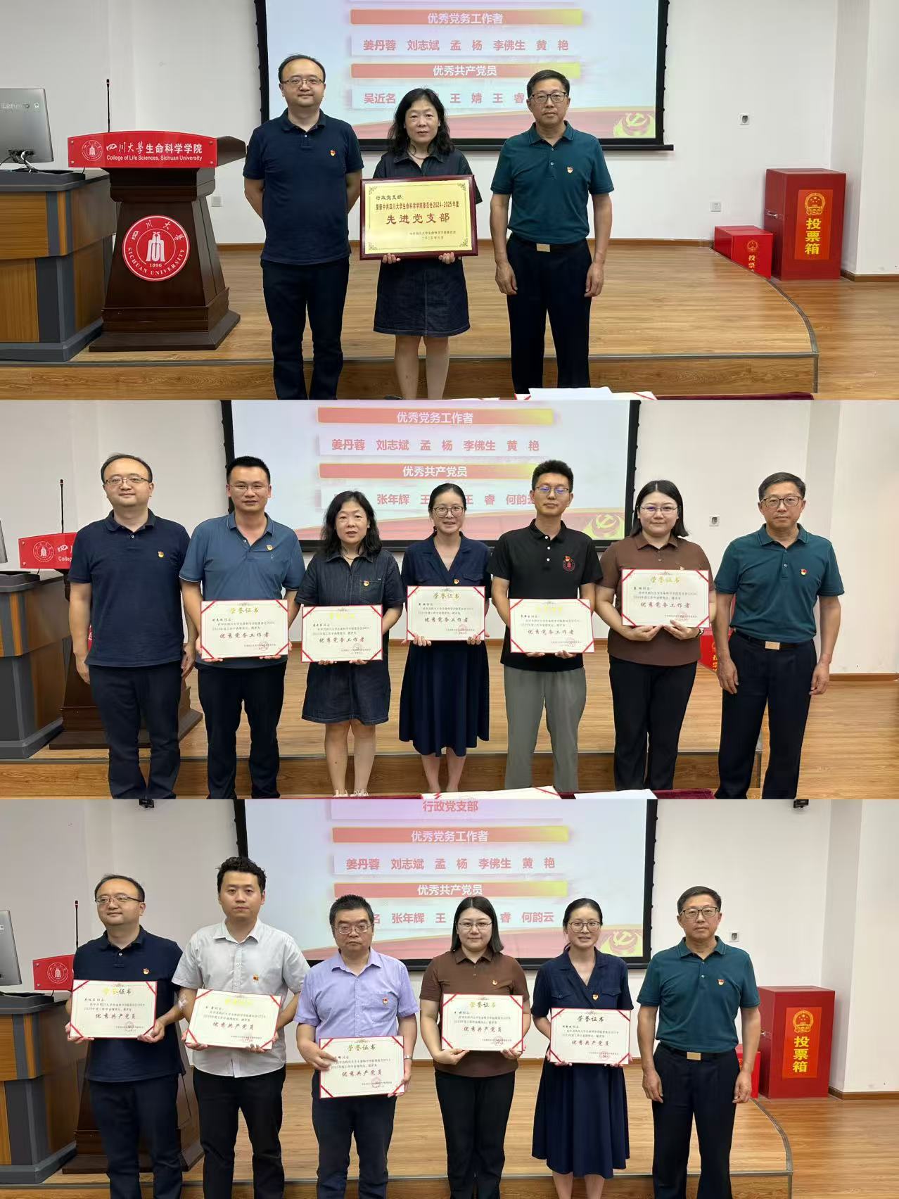 行政党支部荣获“先进党支部”称号,吴近名、张年辉、王婧、王睿和何韵云同志荣获“优秀共产党员”称号,姜丹蓉、刘志斌、孟杨、李佛生和黄艳同志荣获“优秀党务工作者”称号,学院党委领导对获奖的集体和个人表示祝贺并颁发了荣誉证书。