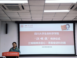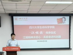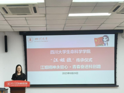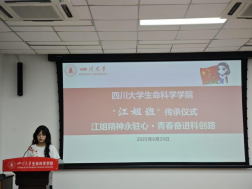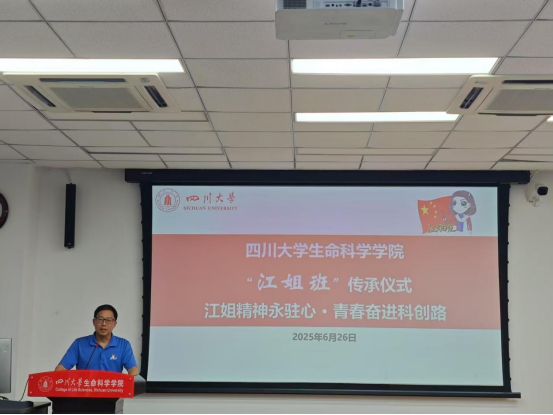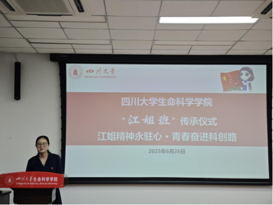 传承仪式上,“江姐班”班长唐弋航作为班级同学代表,向老师和同学们汇报了2021级江姐班自接过江姐班旗帜以来的建设成果,汇报了班级在学习、科研、党建等各个方面取得的新突破,展示了“江姐班”在红色精神的引领下的成长。随后“江姐班”优秀学生代表邓路垚汇报了作为“江姐班”成员的心路历程以及自己参加iGEM大赛的心得体会。她鼓励2024级拔尖班的全体同学们志存高远,脚踏实地,将自己培养成一名又红又专的新时代社会主义建设者。