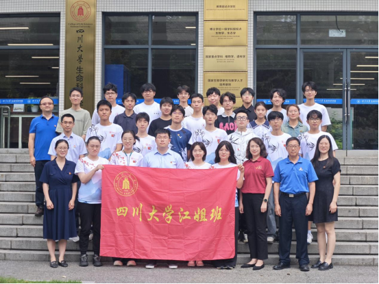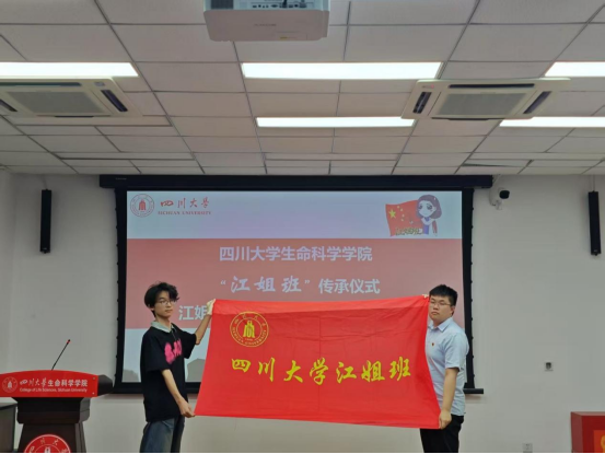 在授旗仪式环节,2024级拔尖班班长邓佳园从“江姐班”班长唐弋航手中,接过了“四川大学江姐班”的旗帜。