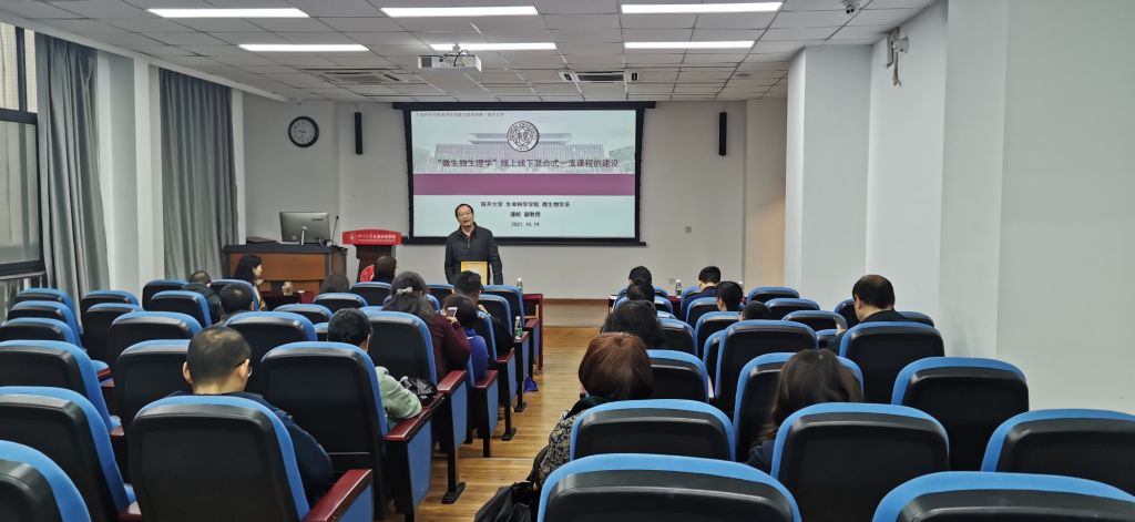 2021年10月19日上午9:30,南开大学437必赢会员中心微生物学系副系主任潘皎副教授在437必赢会员中心A区一楼学术报告厅为我院教师开展以“微生物生理学线上线下混合式一流课程的建设”为主题的教师教研教学活动讲座。本次讲座由教学院长赵云教授主持,学院共计34名教师参加,其中学院专业核心课程团队均有老师代表参加。