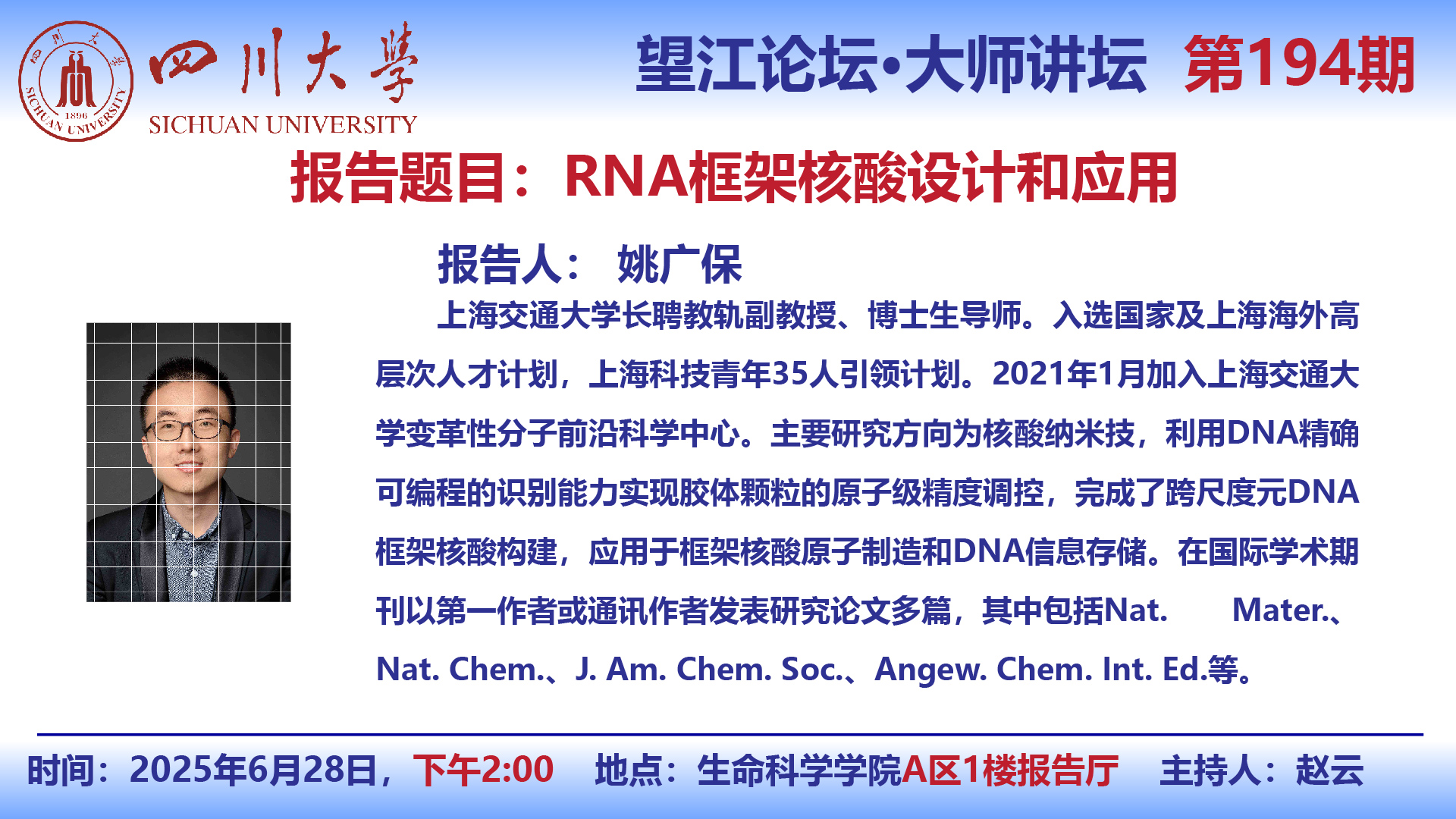 望江论坛-前沿科学讲座(第194期):姚广保副教授6月28日学术讲座