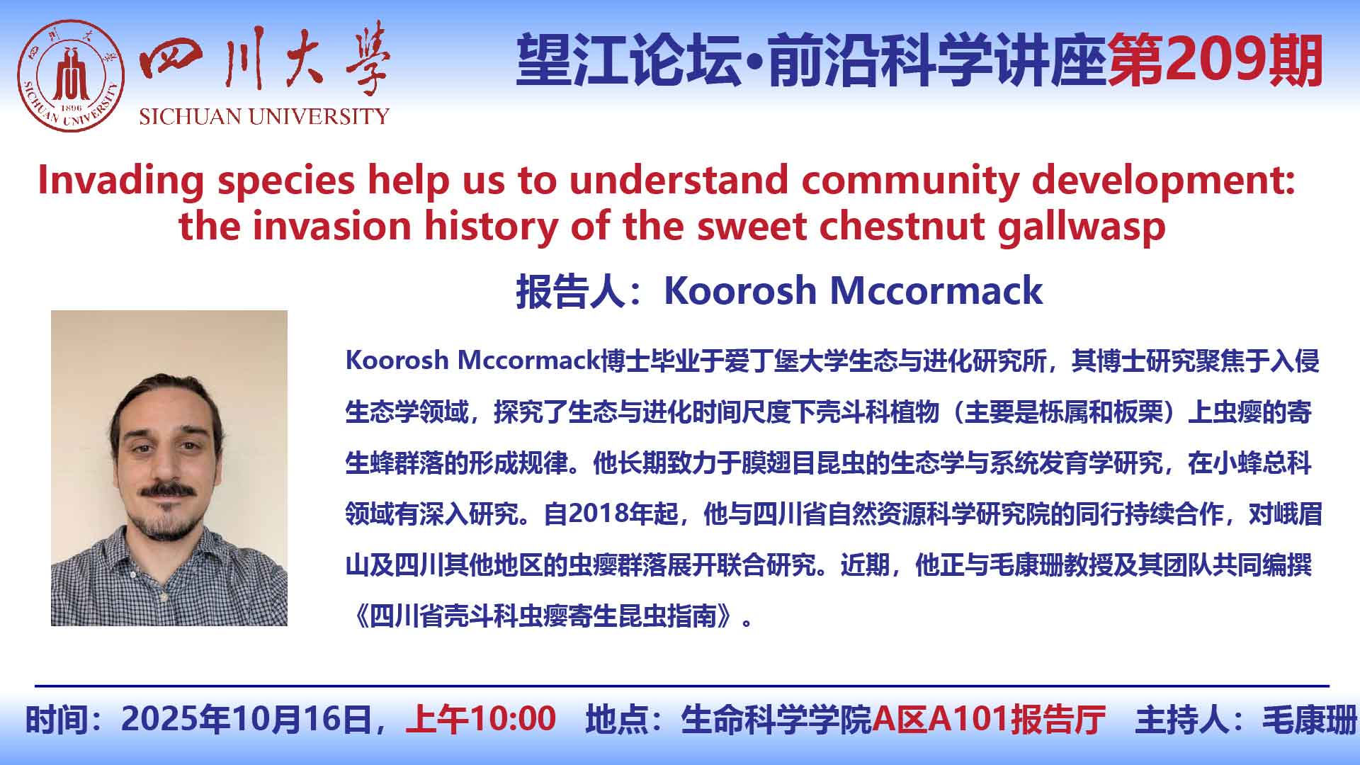 望江论坛-前沿科学讲座(第209期):Koorosh Mccormack博士10月16日学术讲座