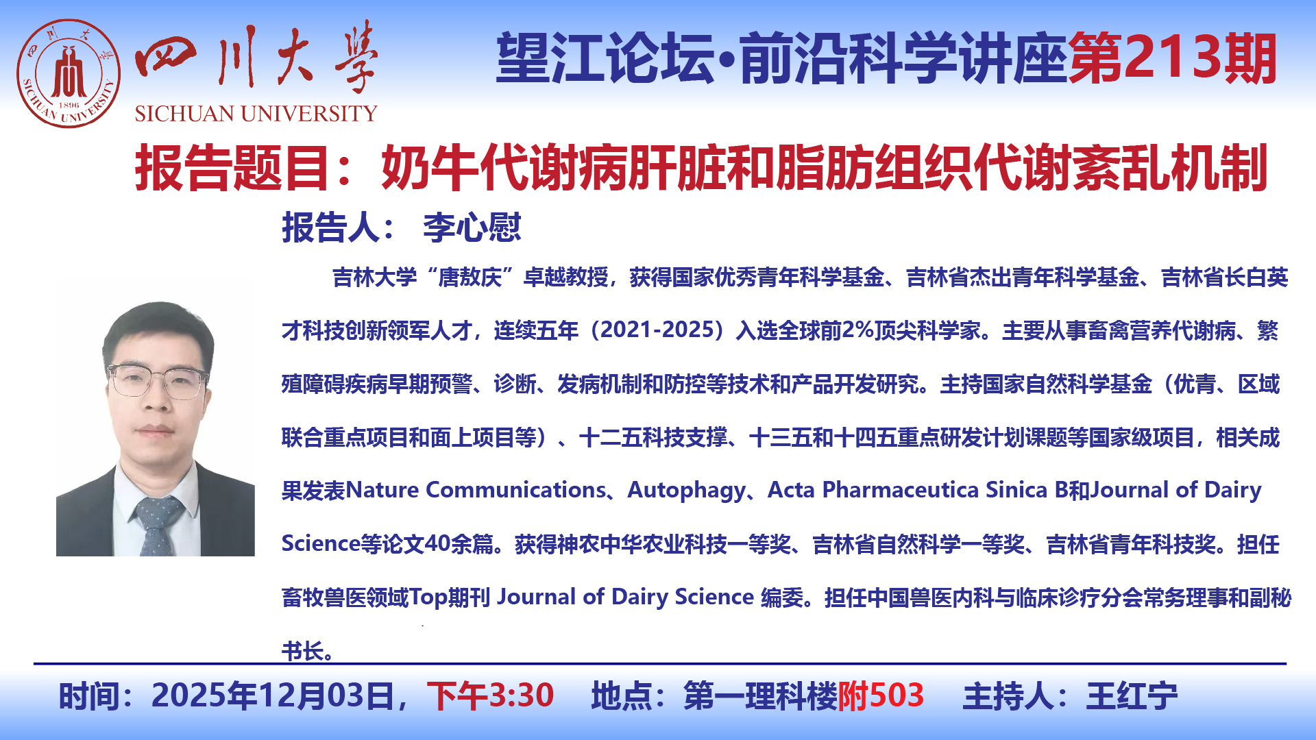 望江论坛-前沿科学讲座(第213期):李心慰教授12月3日学术讲座